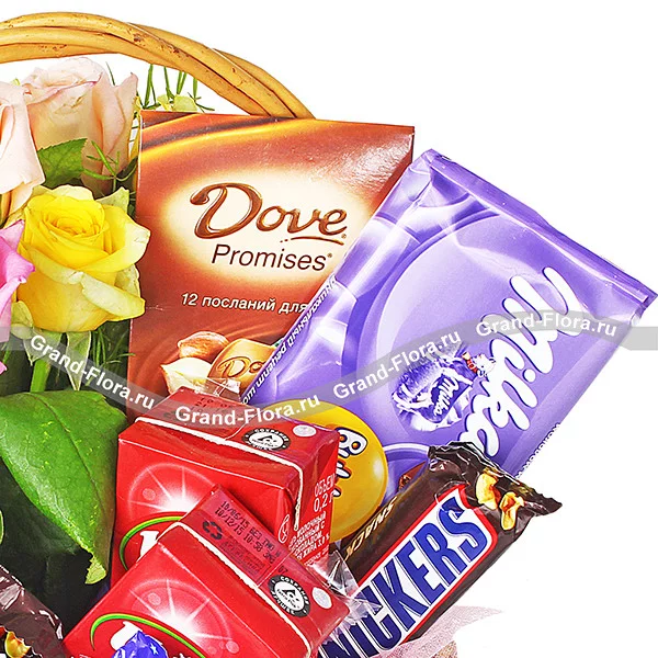 Уменьшенный: шоколад "Milka" - 1 шт., Snikers - 1 шт., шоколад Чудо - 1 шт., шоколад DOVE (12 пожеланий) - 1 шт., Milky Way - 2 шт., Bounty - 2 шт., розы (20 см) - 5 шт., оазис, декор, корзина малая.