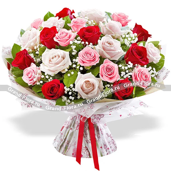 25 роз: роза красная - 9 шт., роза розовая - 8 шт., роза белая - 8 шт., гипсофила - 5 шт., салал - 5 шт., фетр белый, бант красный.