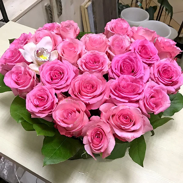 Люкс: роза розовая - 22 шт., орхидея белая - 1 шт., декоративная зелень., декор., оазис.