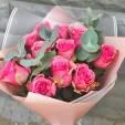 11 роз: роза розовая - 11 шт., эвкалипт - 3 шт., упаковка, лента.
