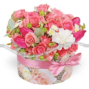 Стандартный: роза кустовая кремовая - 4 шт., тюльпан розовый - 11 шт., статица желтая, статица фиолетовая, оазис, упаковка. Примерный размер 25Х25 см.
