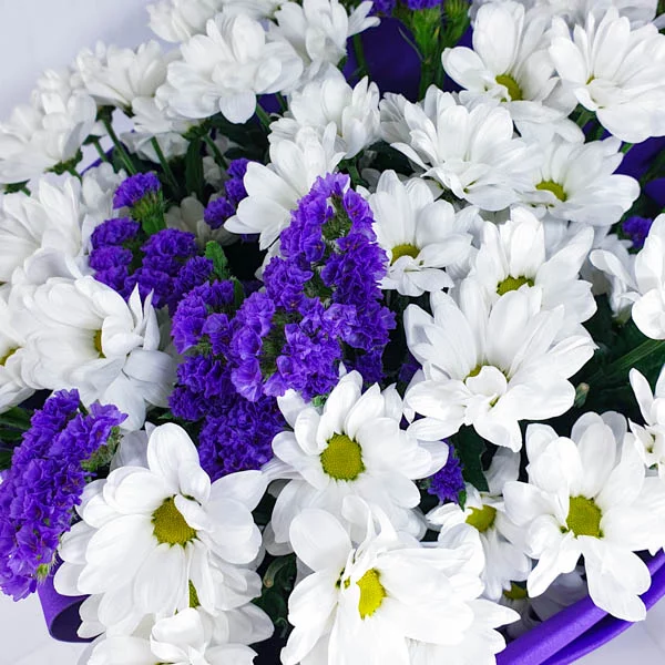 хризантема белая кустовая ромашковая - 15 шт., статица - 8 шт., салал, фетр фиолетовый.  Примерный размер: 40Х40 см.